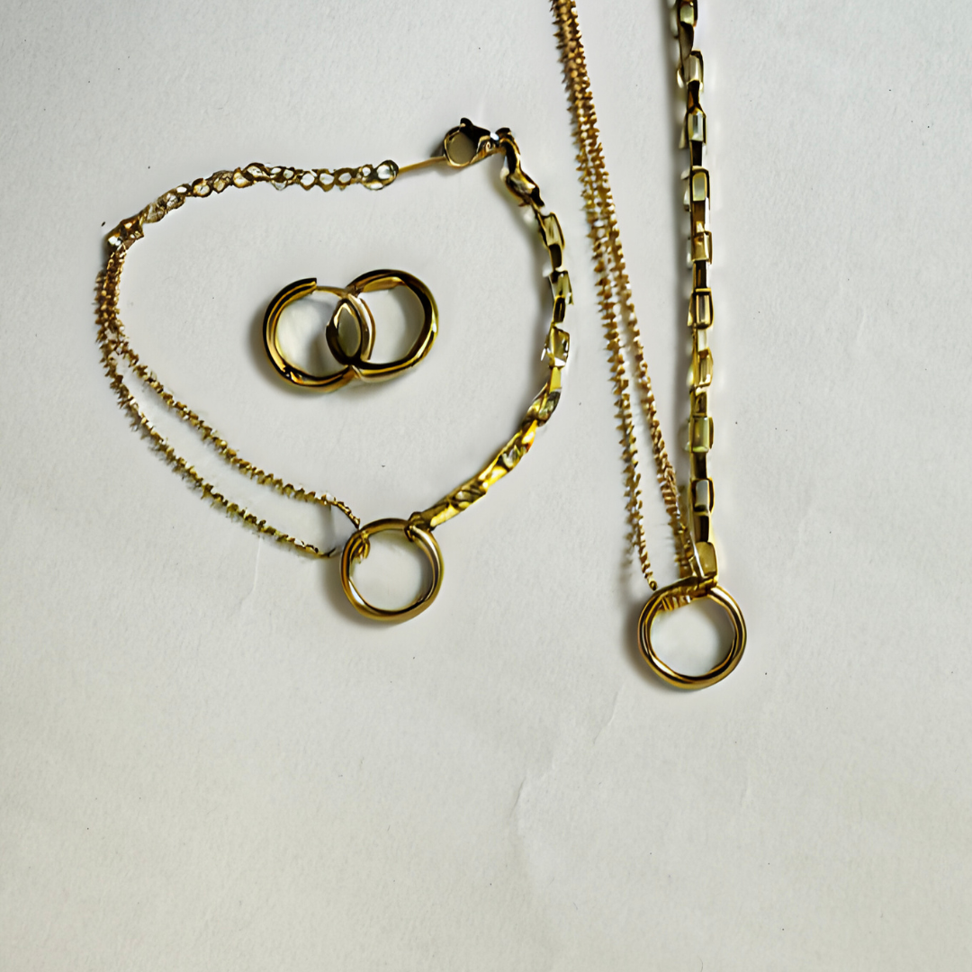 Conjunto 3 unidades, Aretes + cadena + brazalete dijes redondos, Acero Inoxidable chapados oro, color dorado